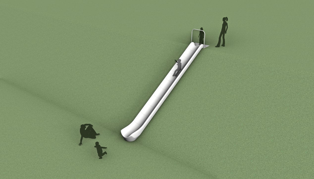 ID Sculpture’s line of modular concrete embankment slides are more durable and stay cooler than plastic or metal slides due to their thermal mass. The polished concrete surface slides comfortably and offers a modern aesthetic to your playscape. The slide system consists of an entry, bed, and exit module. The slide bed modules are designed to gain 1ft of elevation per module on a 30-degree slope and are shippable and easy to assemble on site.