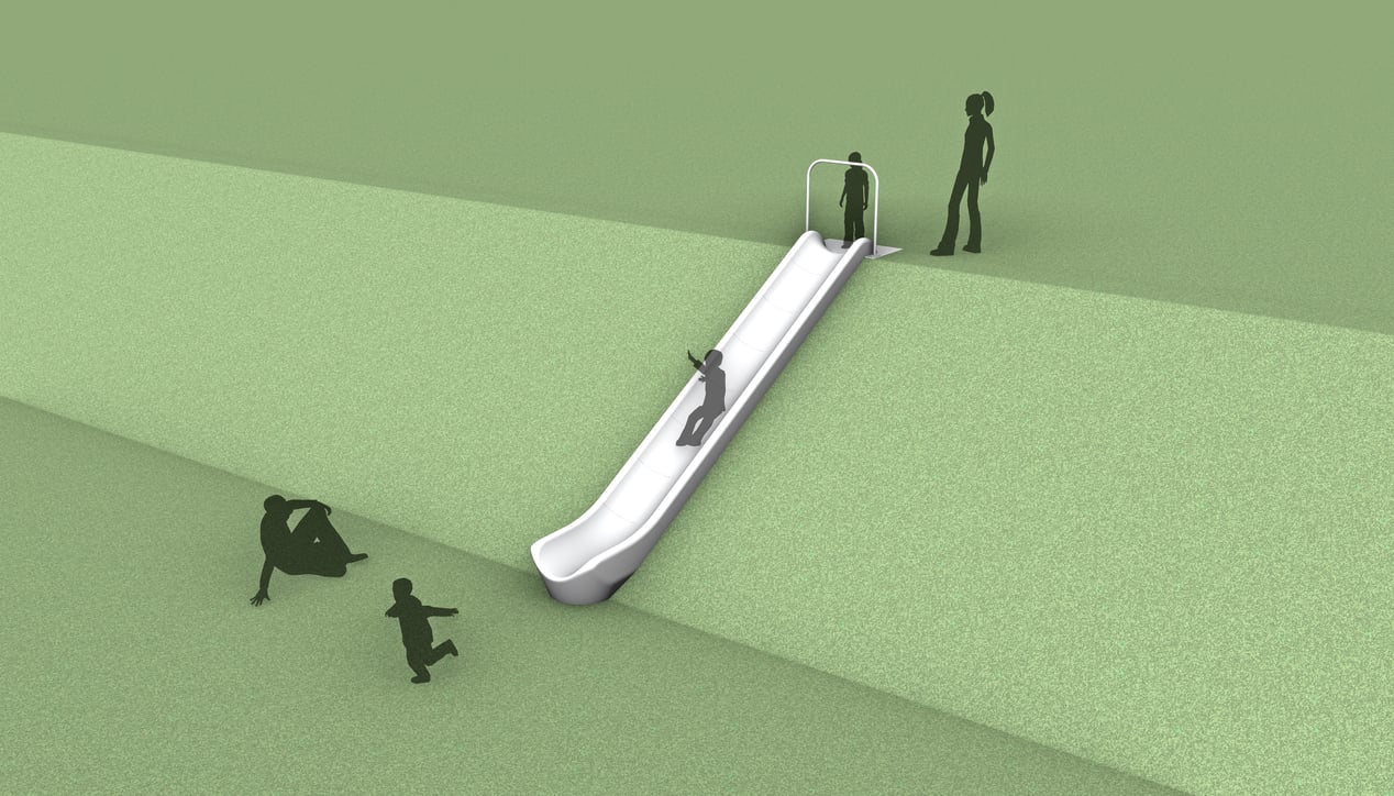 ID Sculpture’s line of modular concrete embankment slides are more durable and stay cooler than plastic or metal slides due to their thermal mass. The polished concrete surface slides comfortably and offers a modern aesthetic to your playscape. The slide system consists of an entry, bed, and exit module. The slide bed modules are designed to gain 1ft of elevation per module on a 30-degree slope and are shippable and easy to assemble on site.