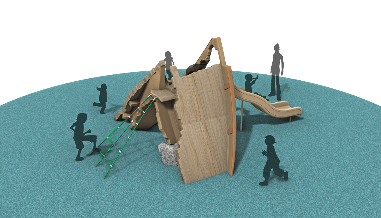 The Broken Ship Climber feels like the remains of a vessel pulled from the pages of Treasure Island. Children can weave through fallen beams and weathered shapes as if uncovering clues left behind by long‑lost sailors. The climber has a slide and a “walk the plank” deck with a ramp net featuring our 9-strand steel braided polyester rope and marine-grade connection hardware for years of maintenance-free play by the ocean.