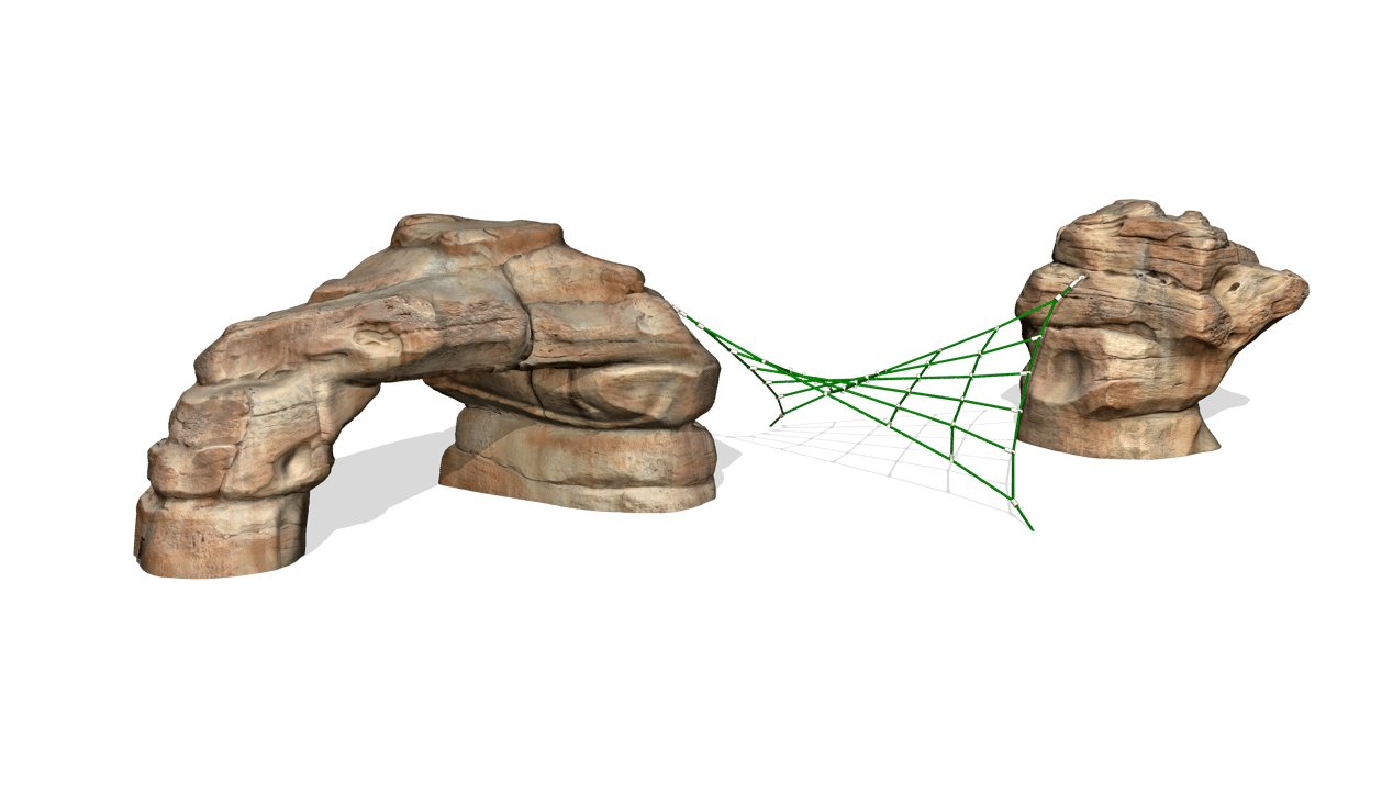 Modeled after layered Southwestern landscapes, Mesa Verde combines our iconic Sandstone Arch and Sandstone Boulder joined by a Hypar Net, creating varied elevations that support climbing and crossing.