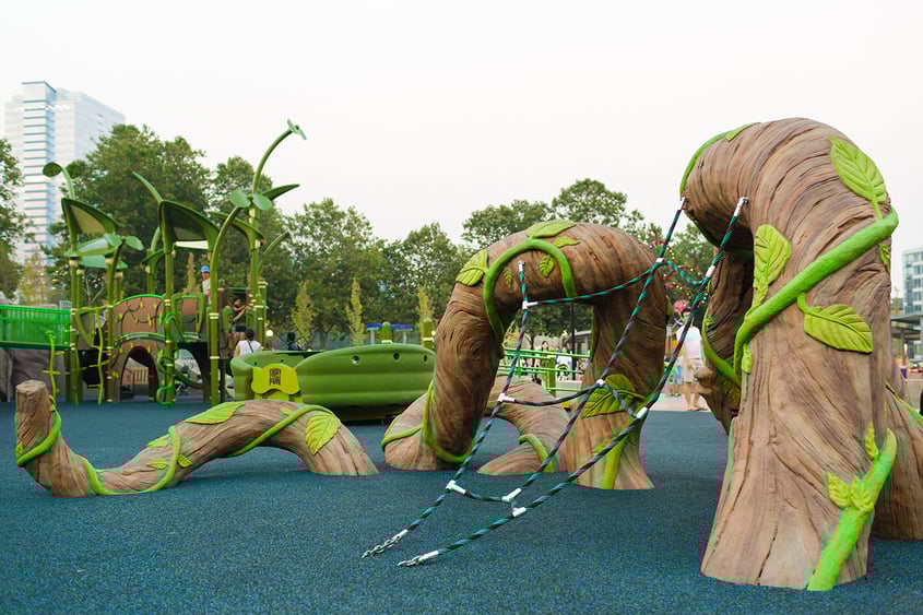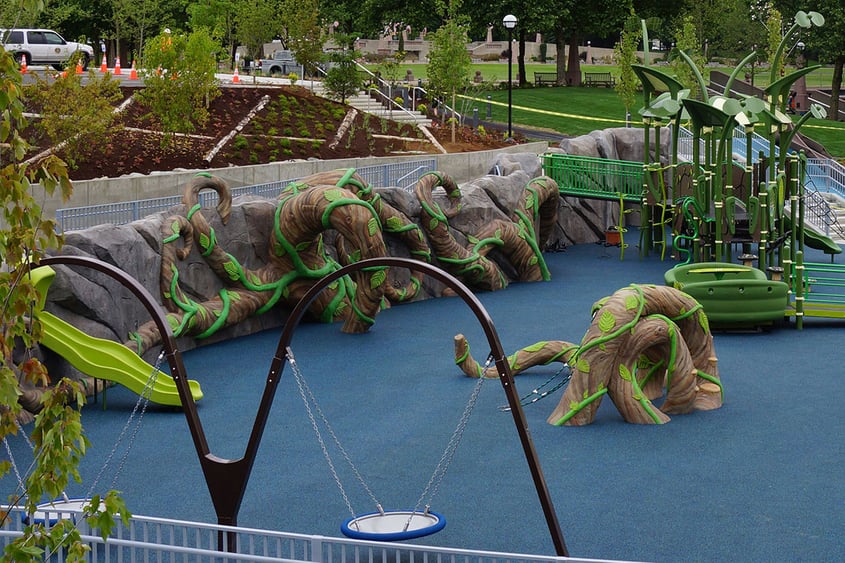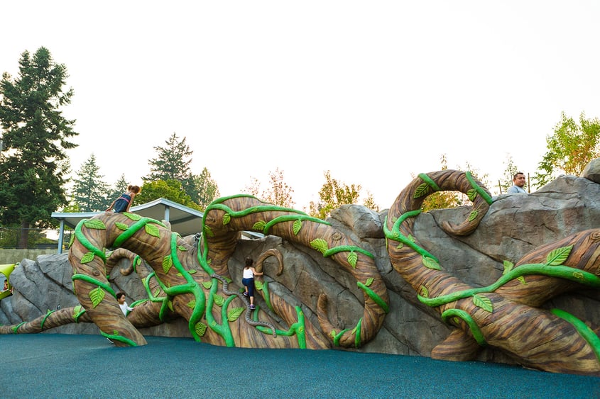 Inspiration Playground is a collaboration between ID Sculpture and Design Concepts of Lafayette, Colorado. The project was inspired by the story of Jack and the Beanstalk and integrates a whimsical “tree of life” along with a retaining wall filled with vines, rocks, and critters.